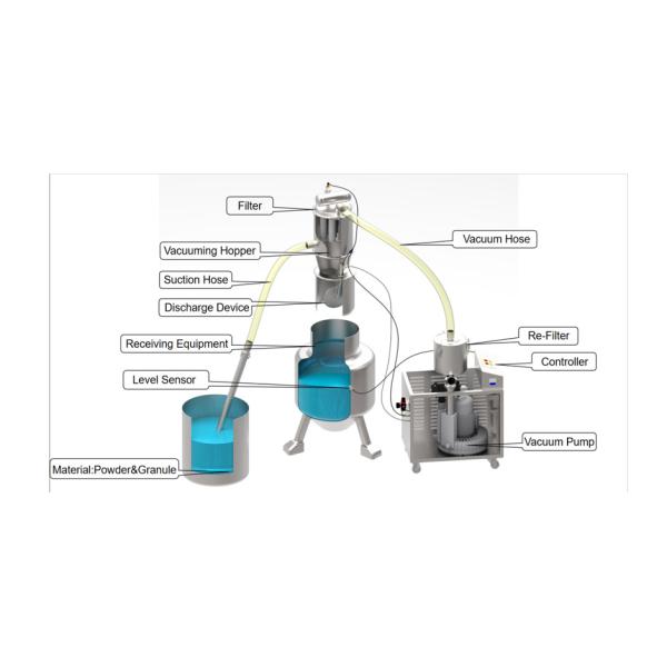 ZKS vacuum conveyor uses vacuum pump as the power source, when the vacuum pump works, the whole system generates negative pressure to form vacuum airflow, the powder materials along with air are sucked into vacuum hopper through the suction hose, the filter separates the air from the materials, when the material is filled with the vacuum hopper, the controller will automatically cut off the power supply, the vacuum pump stops working, the discharge door opens automatically, and the material falls into the hopper of the feeding equipment. At the same time, the compressed air automatically cleans the filter through the pulse back-blow valve. When the set time is reached or the material level sensor sends the feeding signal, the feeding machine will automatically repeat the previous working cycle.